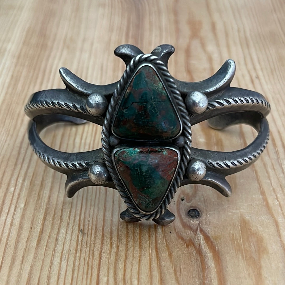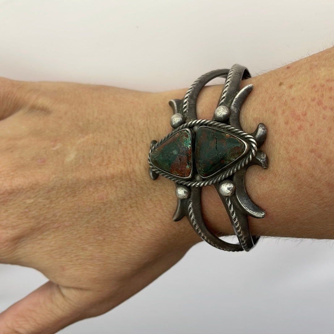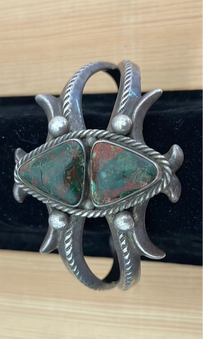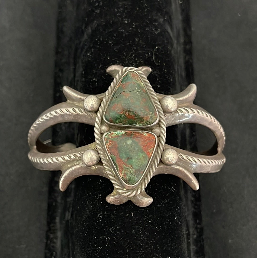 This beautiful cuff sand-cast bracelet is crafted with high-quality materials. At 6 3/4” in circumference, the dark orange and green tones are sure to make a statement. Perfect for everyday wear or special occasions.