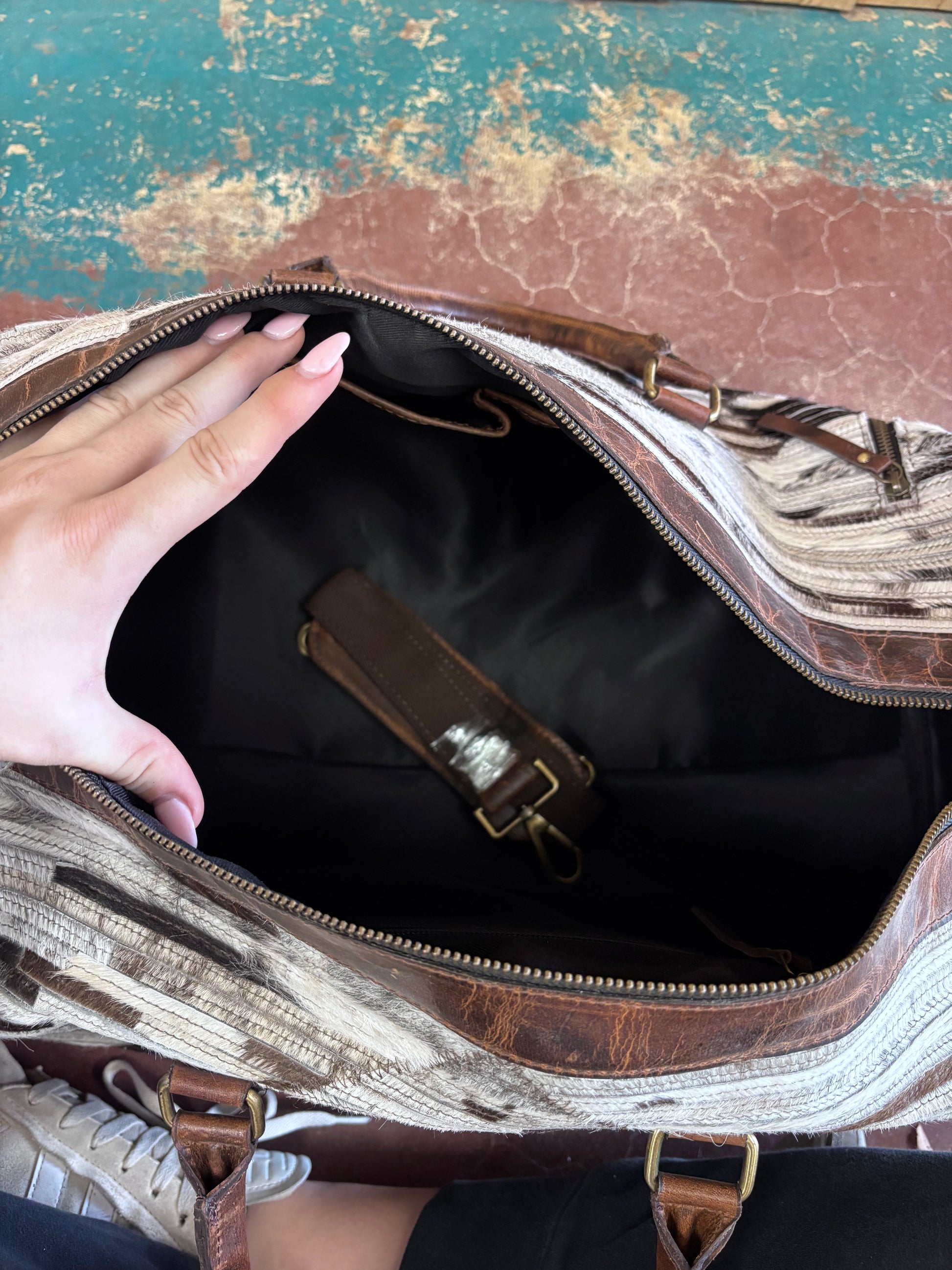 Carry your essentials in style with this striking duffle bag featuring authentic white and black cowhide arranged in bold cross patterns. Measuring 21 inches long by 19 inches wide, it's the perfect size for weekend getaways or gym sessions. Rich brown leather handles and reinforced edges ensure durability and comfort, while five strategically placed pockets—two exterior and three interiors—keep your belongings organized and secure. The eye-catching geometric design makes a statement wherever you go, blending rugged Western charm with practical functionality.