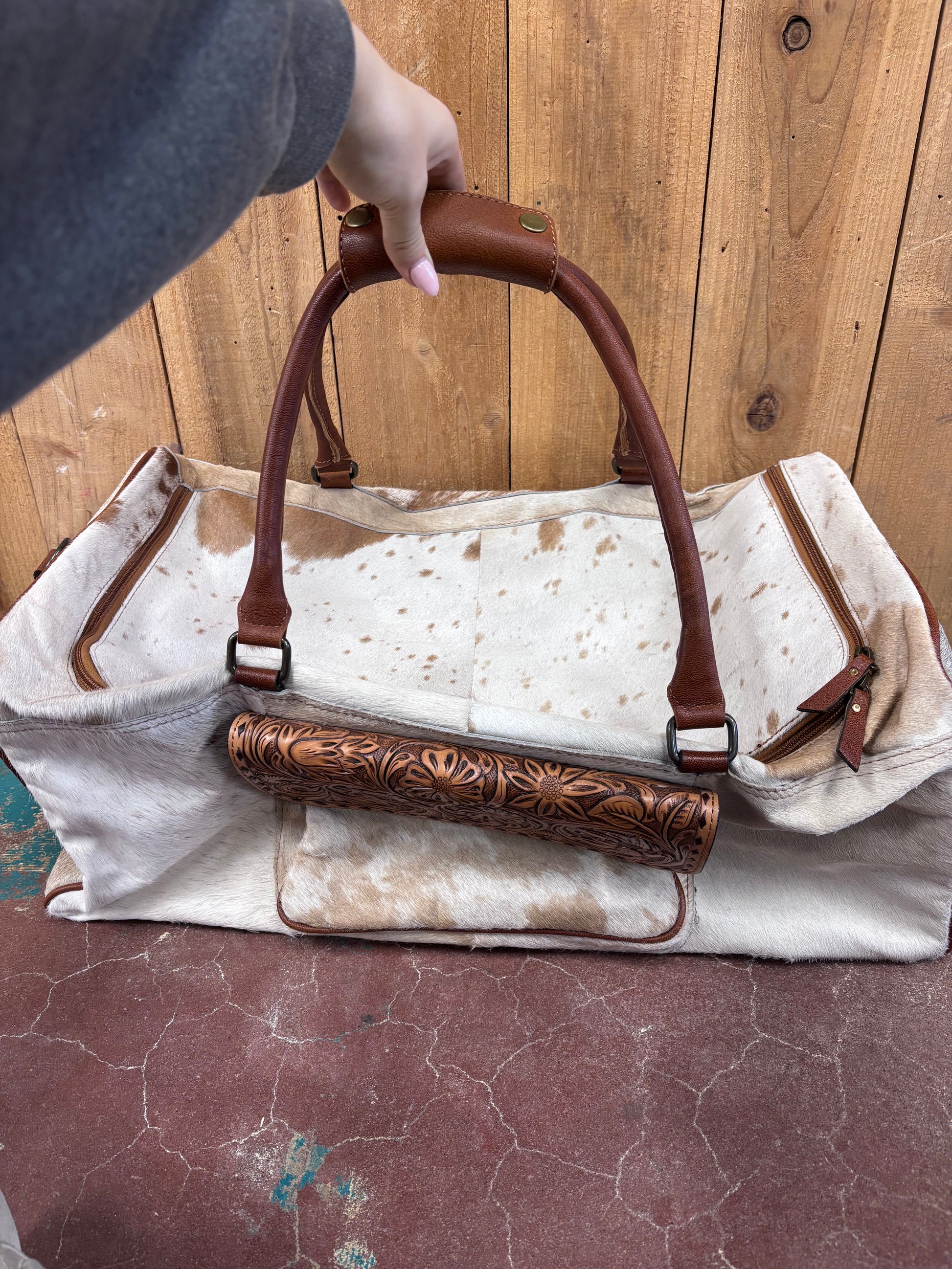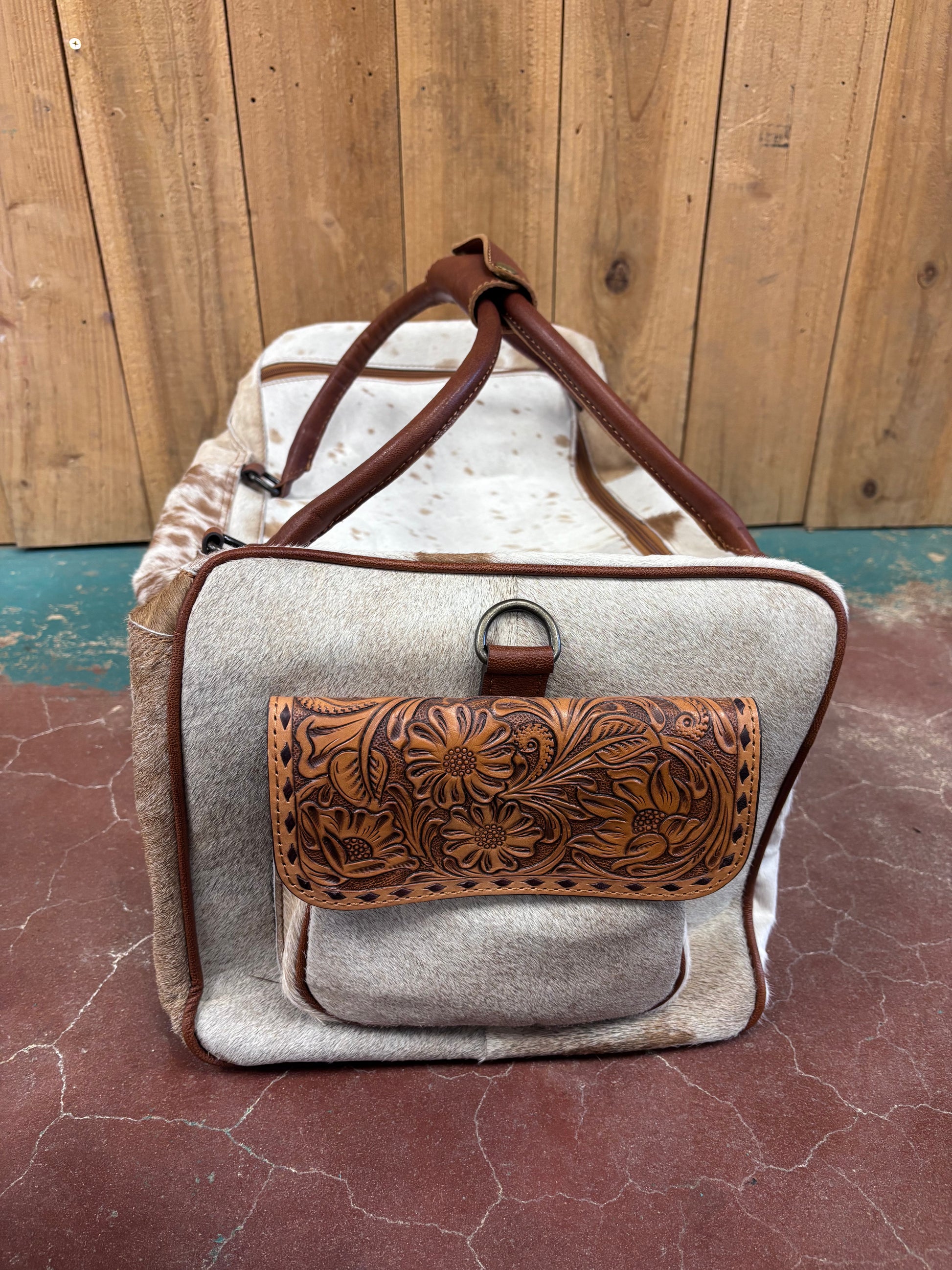 This striking duffle bag combines rustic charm with practical functionality. Crafted from genuine white cowhide with rich brown spots, it delivers authentic Western style that turns heads. Measuring 22 inches long and 16 inches wide, it offers generous capacity for weekend getaways or everyday adventures. Three exterior side pockets feature beautiful flower tooling, while four interior pockets keep essentials organized and accessible. The matching bag strap and handle clip ensure comfortable, versatile carrying options. Whether you're heading to the ranch or the road, this distinctive bag makes a bold statement while keeping your gear secure and within reach.