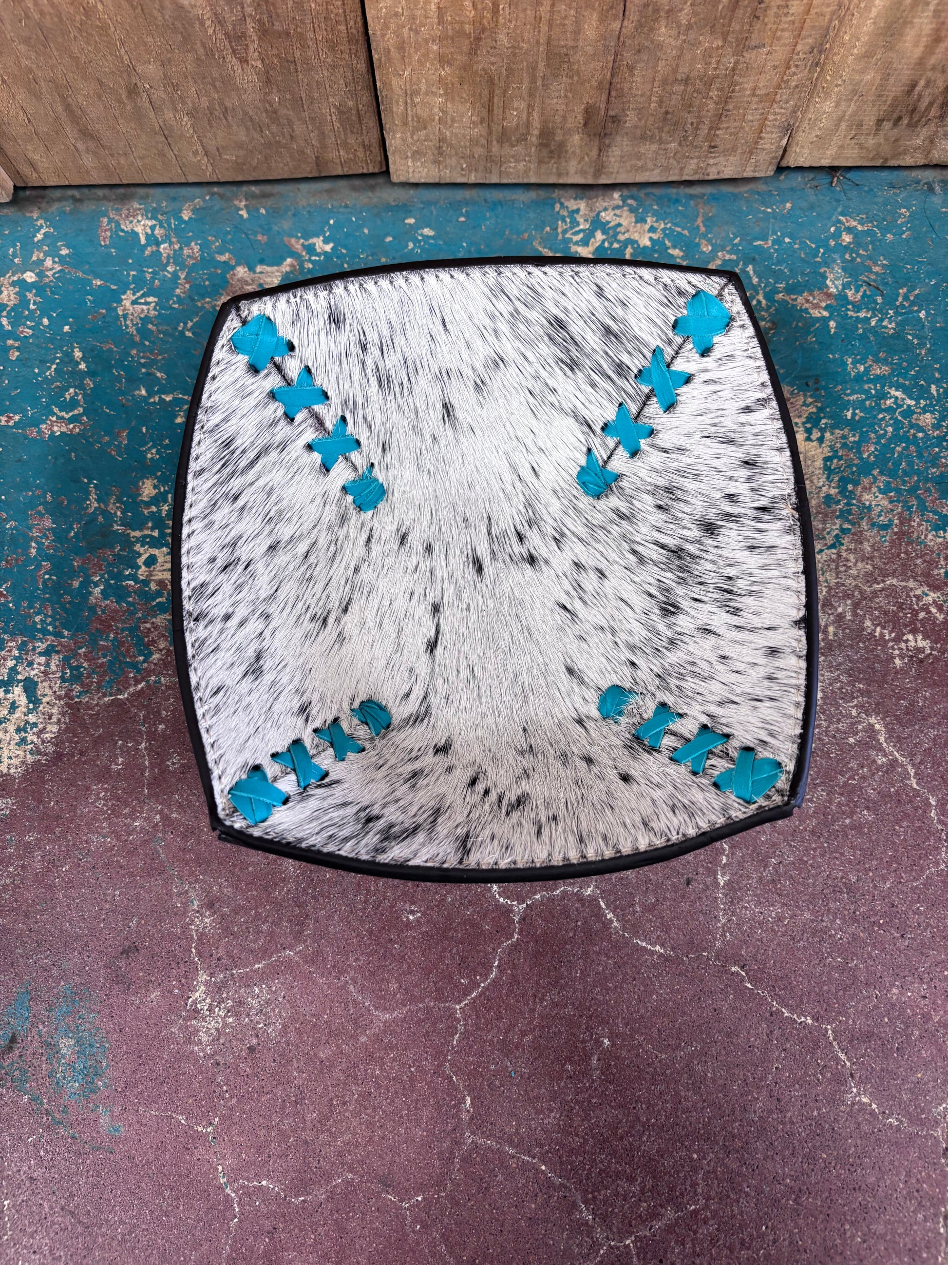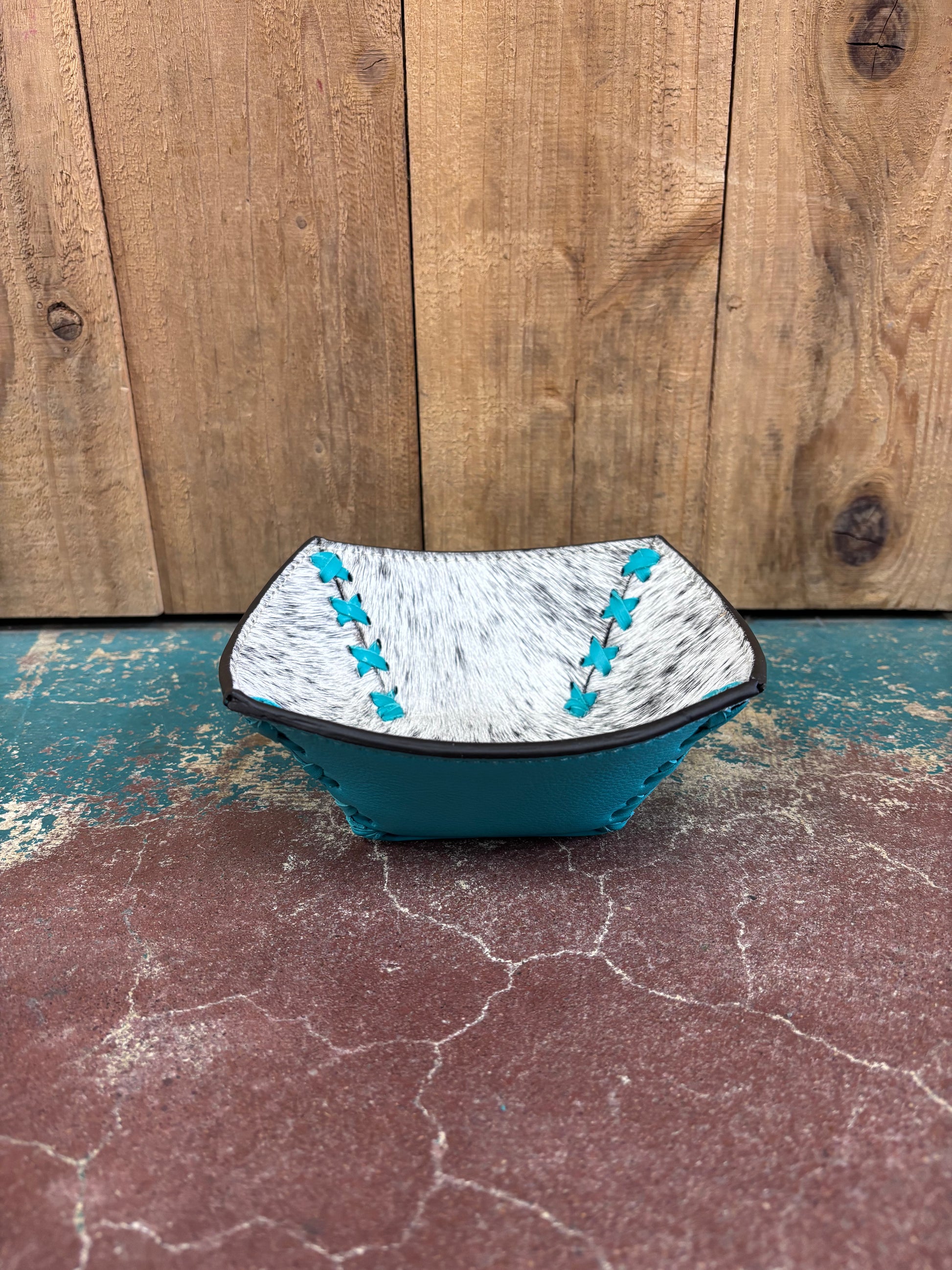 Organize your treasures in style with this striking jewelry tray that combines rustic charm with modern flair. Measuring 7.5 inches square, it's the perfect size for your nightstand, dresser, or vanity. The bold white cowhide pattern creates visual interest while the vibrant turquoise leather accents add a pop of color that elevates any décor. Durable and beautifully crafted, this tray keeps your rings, bracelets, and watches easily accessible while protecting them in one gorgeous display piece.