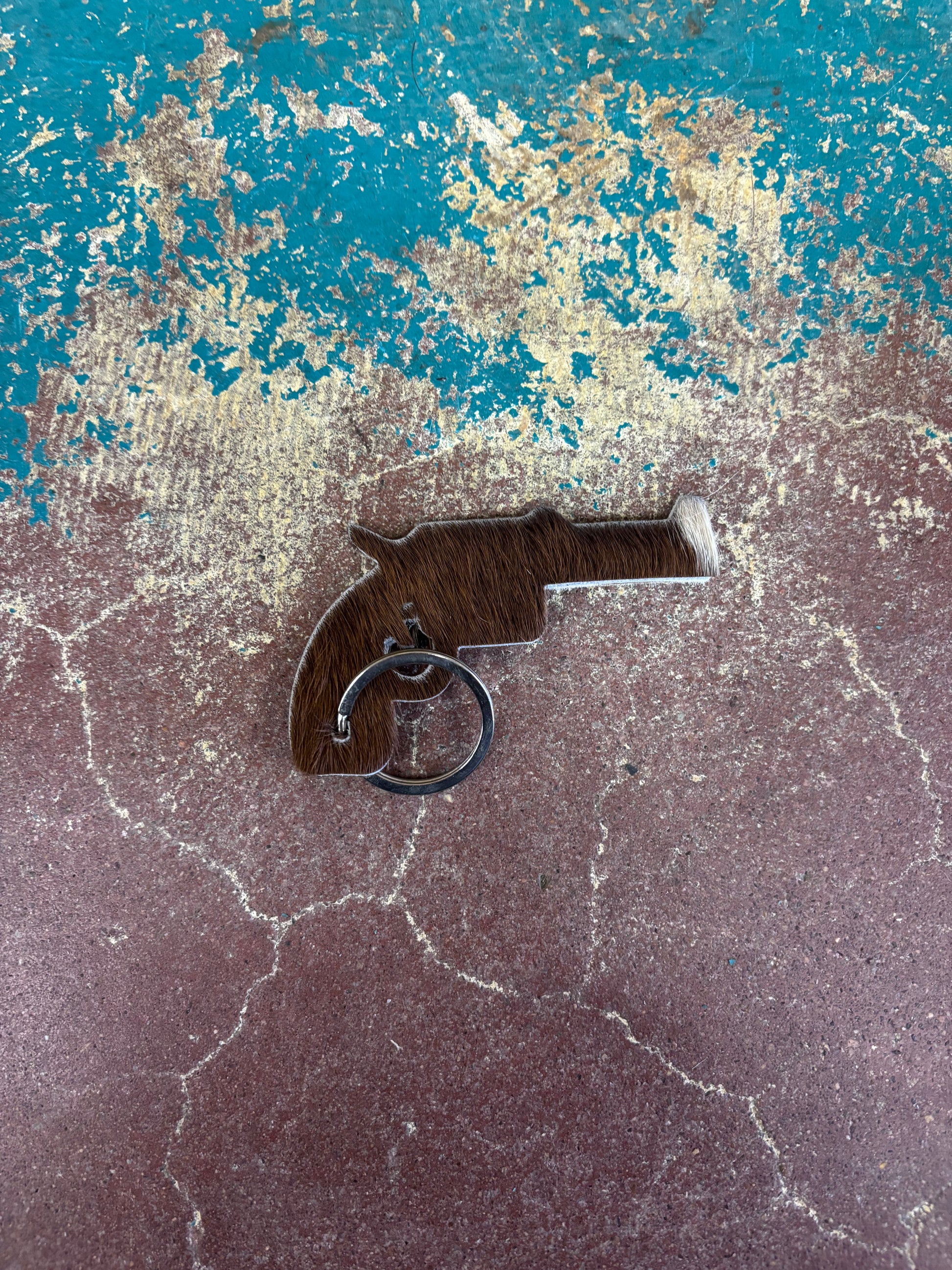 Carry a piece of rugged Western heritage with this handcrafted Brown and White Cowhide Pistol Key Chain. Measuring 2 inches tall by 3.5 inches wide, this durable accessory features authentic brown and white cowhide on both front and back, paired with a sturdy silver key ring. Perfect for keeping your keys organized while showcasing genuine artisanal craftsmanship. A practical yet distinctive addition to any collection. *Cowhide may vary*